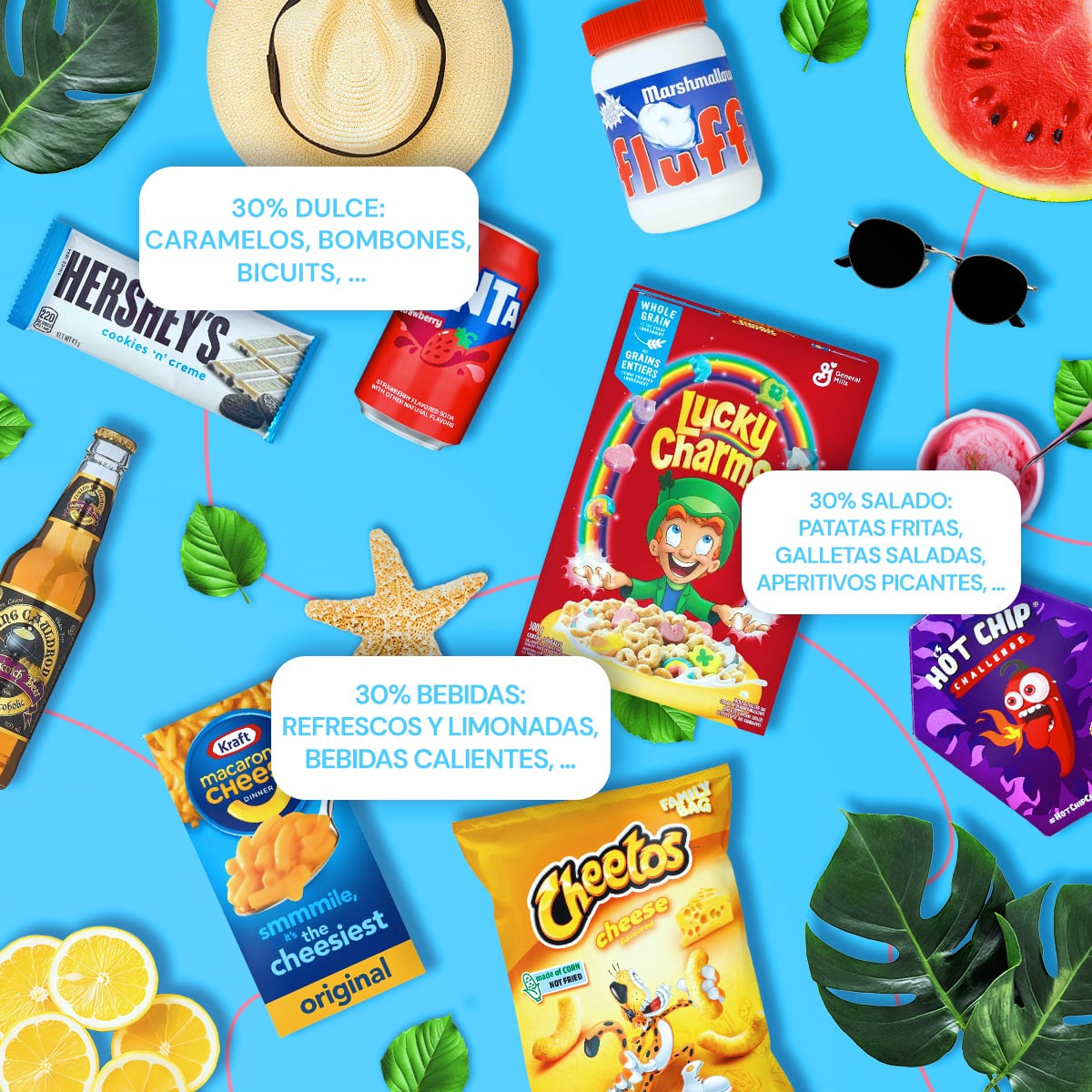La Discovery Box es una selección de productos americanos y asiáticos en 3 formatos: XL, XXL, XXXL. Contiene productos dulces, salados y bebidas.