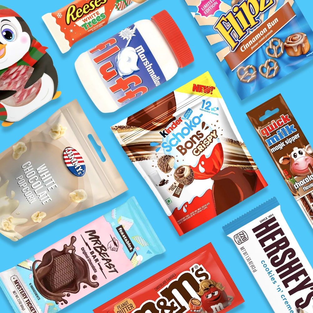 Malvaviscos Durkee Fluff, Cerveza Harry Potter, Caldero Volador, Caramelo de Mantequilla, Jelly Belly Beans, Palomitas de Maíz con Mantequilla, M&M's, Mantequilla de Cacahuete, Flipz, Chocolate con Leche, Quick Milk, Chocolate Mágico para Beber, Huevos Kinder Bueno, Avellana, Kinder Schoko Bons, Bastones de Caramelo Crujientes Pequeños, Menta Navideña, Reese's White Peanut Butter Cups, Luces Disco de DJ Santa, Mr Beast, Feastables, Chocolate con Leche, Wonka, Nerds, Caramelos Frosty, Ferrero Rocher, Chocolate Blanco